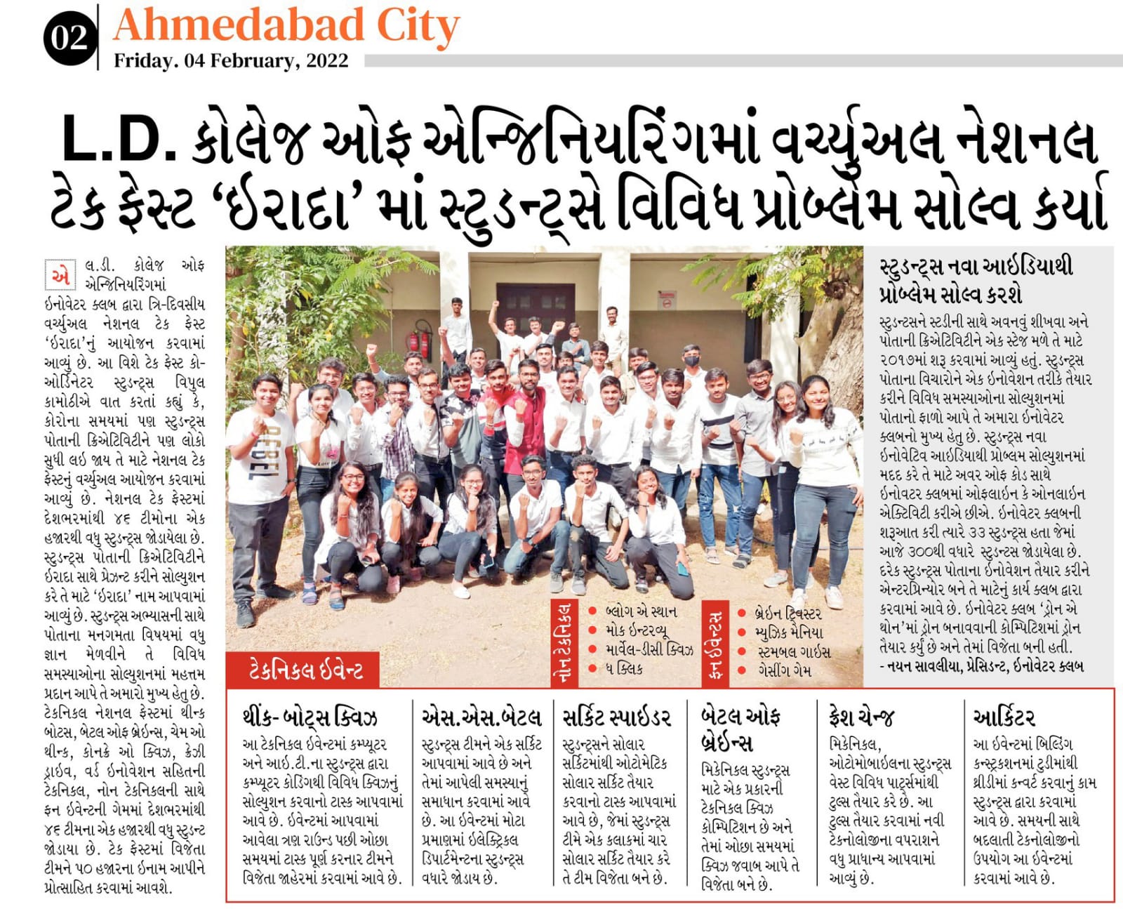 IRADA 2022 marked the first-ever national-level tech fest organized by the Innovator Club of L.D. College of Engineering. Signature events included INNOVATHON, a hackathon encouraging boundless innovation, and INN-O-VICHAR, an inspiring talk show. The fest featured 50+ technical, non-technical, and fun events, attracting 5000+ participants nationwide.